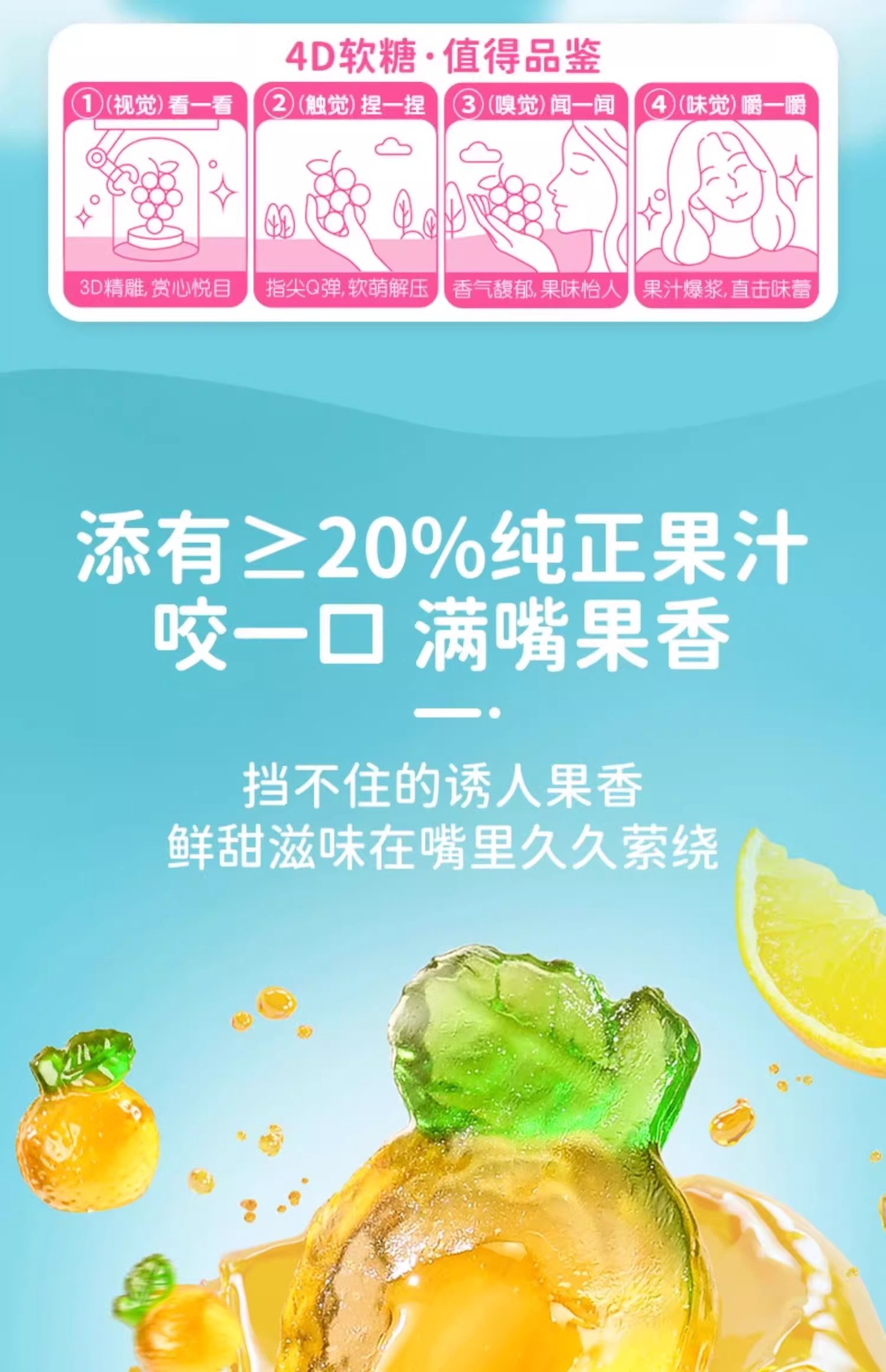 包装规格4D水果爆汁软糖(混合口味)228g,4D水果爆汁软糖(混合口味)450g